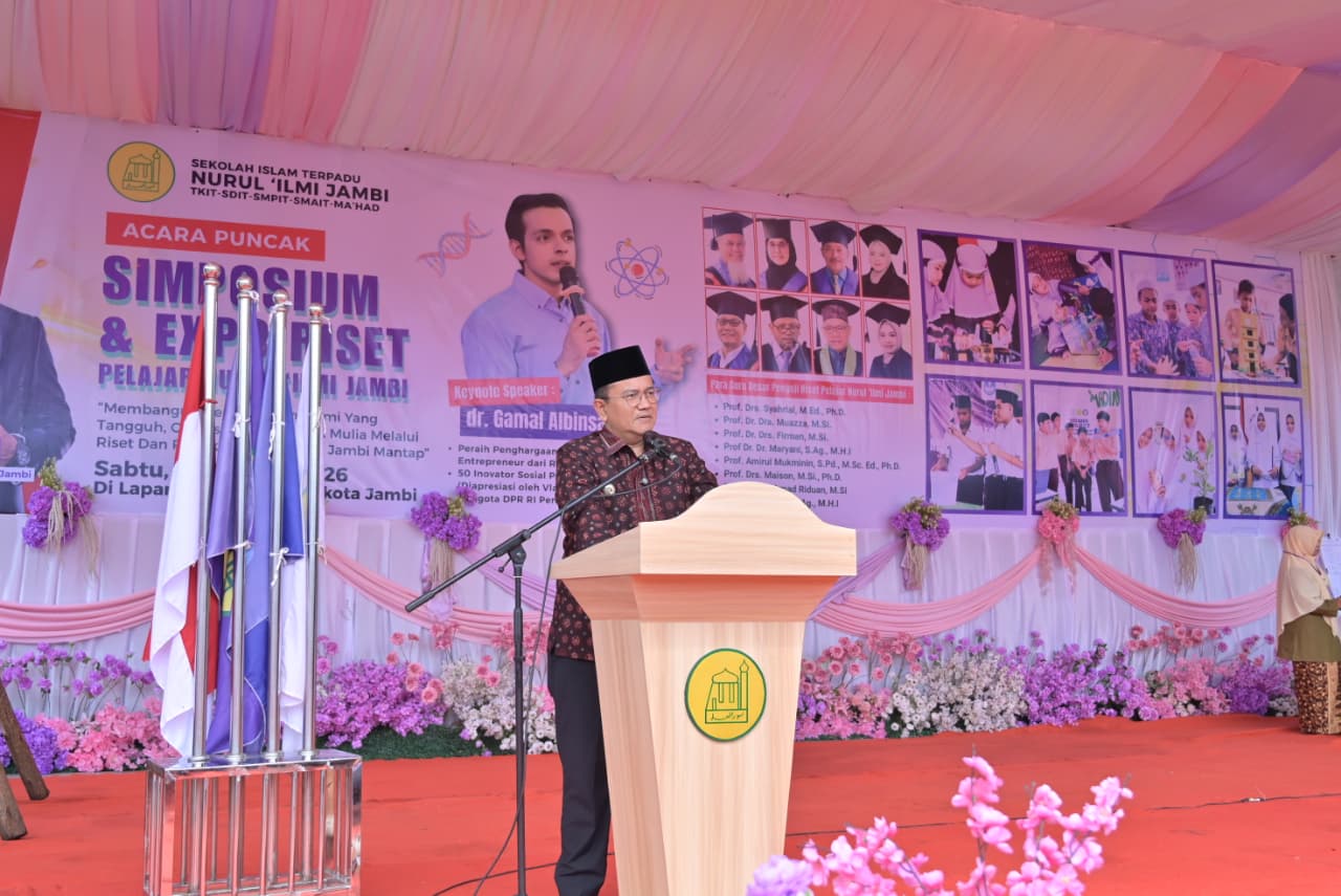 TarunaKota.com, Jambi – Wali Kota Jambi, Dr. dr. H. Maulana, M.K.M, bersama Gubernur Jambi, Dr. H. Al Haris, S.Sos., M.H, secara resmi membuka puncak Simposium dan Expo Riset Pelajar Nurul Ilmi Jambi di Lapangan Utama Kantor Wali Kota Jambi, Sabtu (10/01/2026).