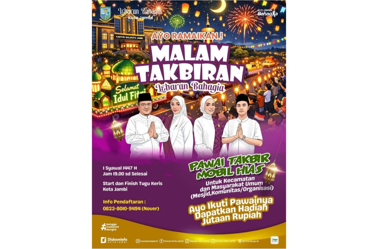 TarunaKota.com, Jambi – Menyambut hari kemenangan Idul Fitri 1447 Hijriah, Wali Kota Jambi, Maulana, dijadwalkan melepas langsung kegiatan “Pawai Takbir Keliling Mobil Hias”. Pusat kegiatan akan berada di kawasan Tugu Keris Siginjai, Kotabaru, Kota Jambi, Minggu (15/03/2026).